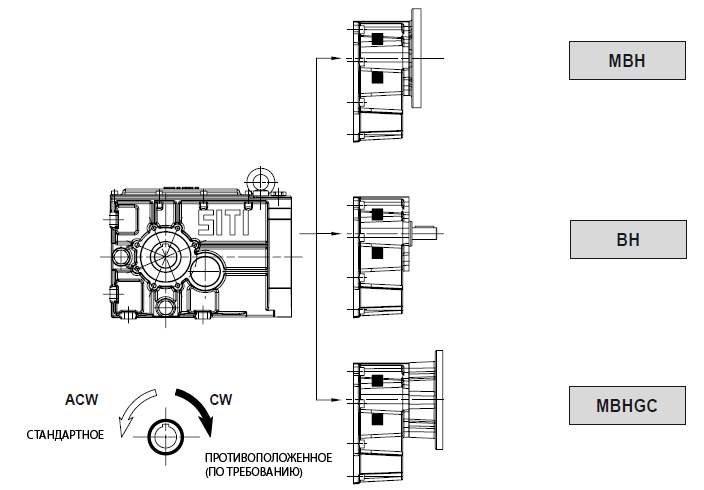 Цилиндро-конические мотор-редукторы серии MBH производства Италия (SITI) используются в качестве привода различных машин и агрегатов. Редукторы MBH имеют хорошие показатели КПД, что позволяет эксплуатировать их в тяжелых условиях до 24 часов в сутки. Вращение передается под прямым углом, передаваемая мощность в пределах 0,25 – 55 кВт. Линейка MBH состоит из девяти типоразмеров, комплектуются редукторы общепромышленными асинхронными электродвигателями. Редукторы MBH 56 изготовлены из сплава алюминия марки EN AC-46100 UNI EN 1706, остальные типоразмеры из серого чугуна марки ENGJL-250 UNI EN 1561. В качестве дополнительной опции редуктора, начиная MBH 100 могут, комплектоваться эластичной муфтой на выходном валу (исполнение MBHGC).