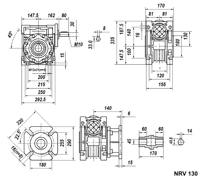 Червячный одноступенчатый редуктор NRV 130 с входным цилиндрическим валом. Предназначен для снижения частоты вращения и увеличения крутящего момента.